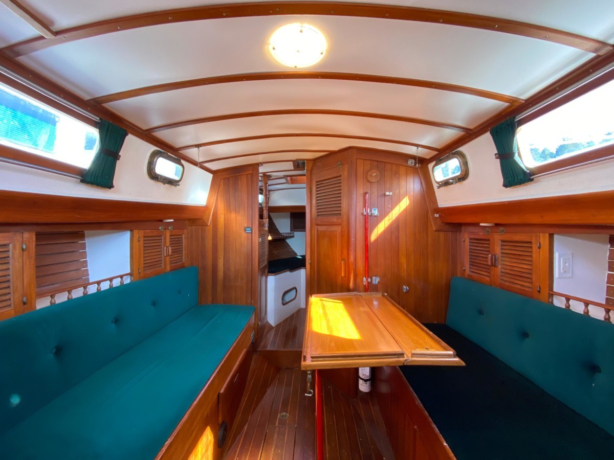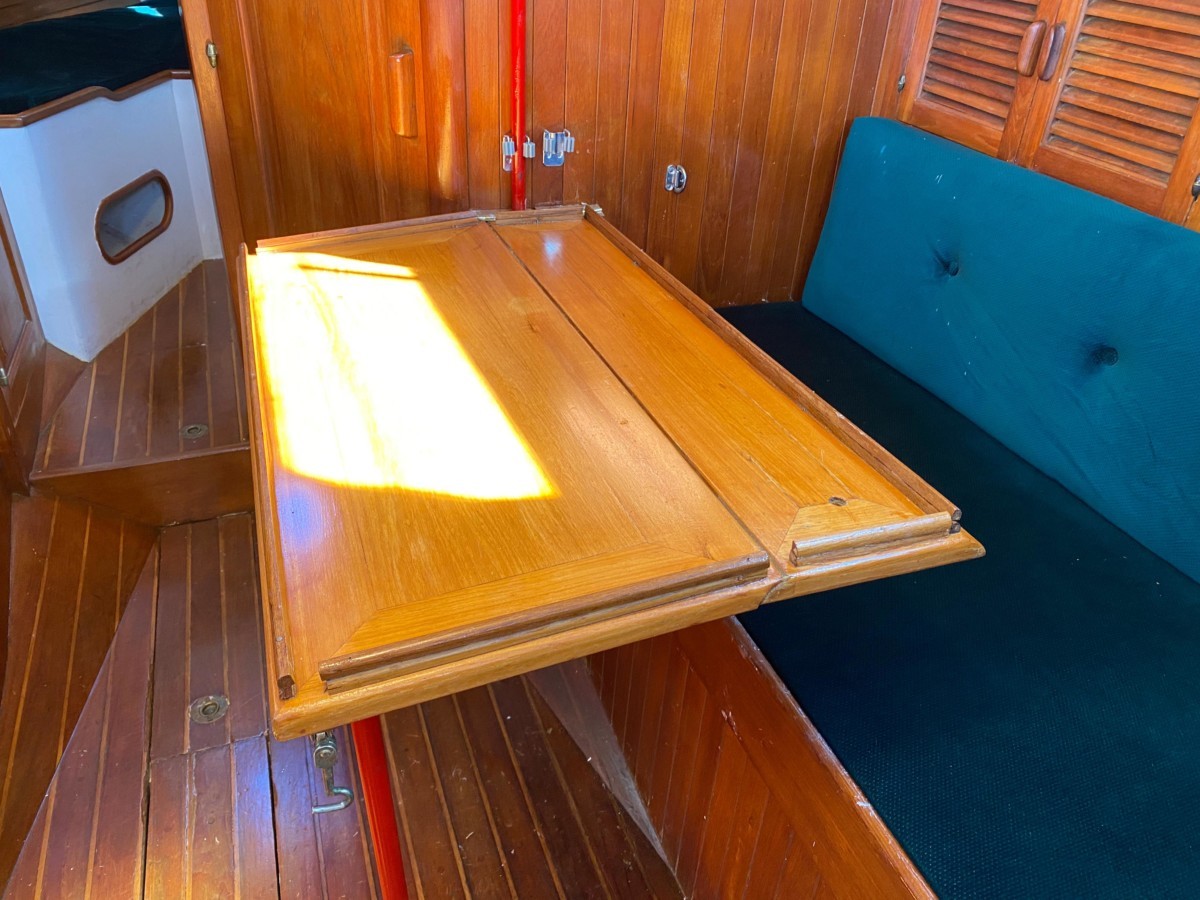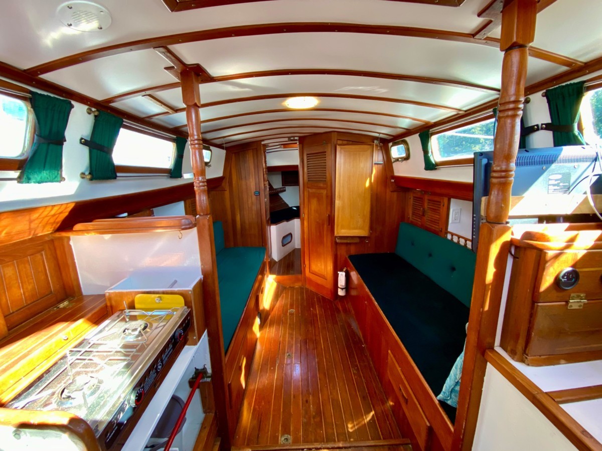 Forward double v-berth features warm teak hull lining with teak shelving above to both port and starboard. Just aft is a hanging locker to port and enclosed head to starboard. The main salon is bright with teak bracing in the head liner and featuring a center folding table with settee/berths to port and starboard. The galley is located to port with a two burner cooktop and SS sink. The companionway is on centerline, and there is a top load refrigeration to starboard as well as a chart table and storage.