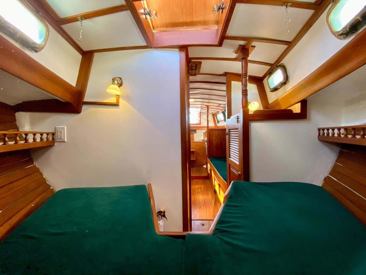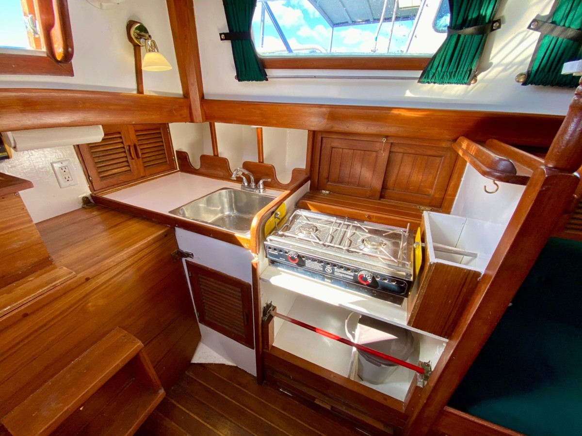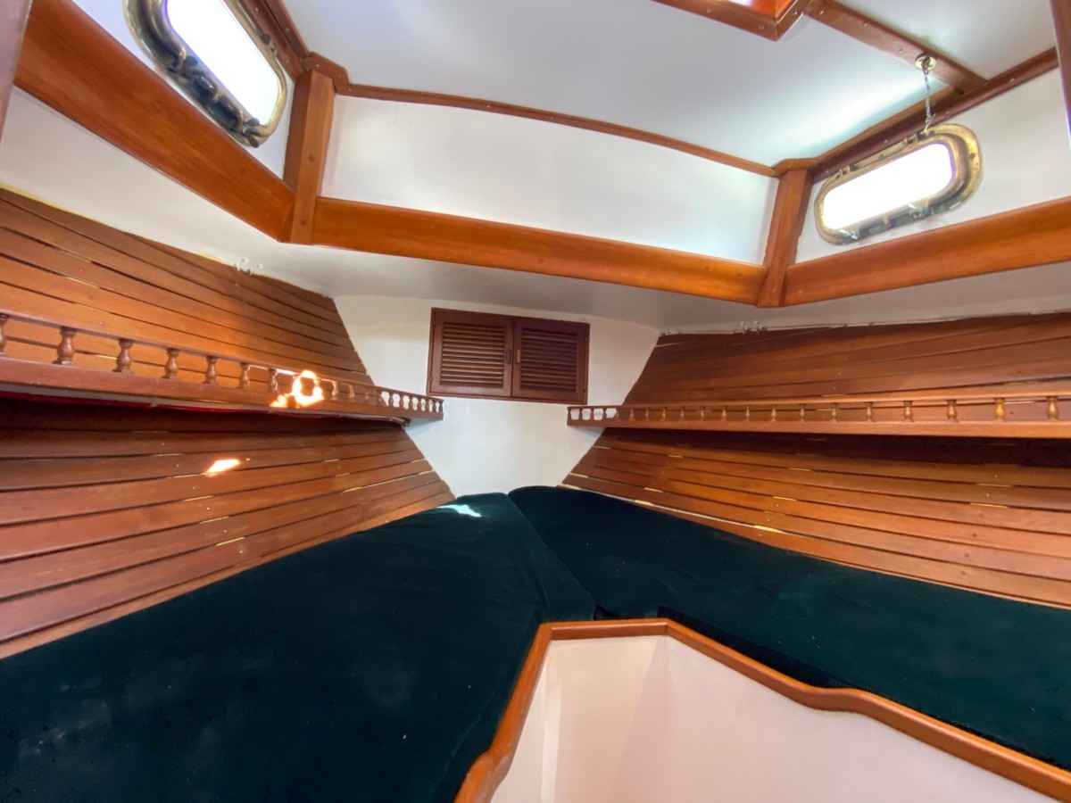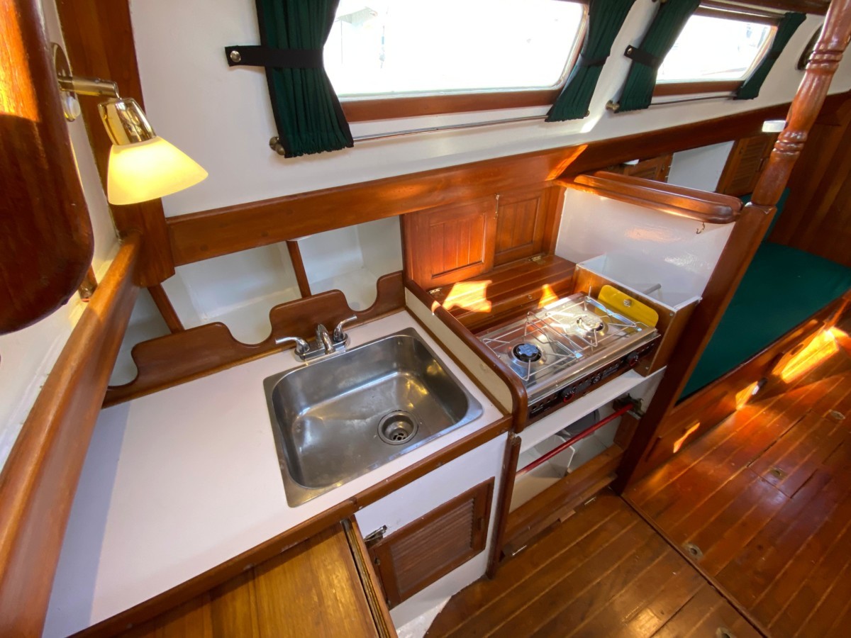 Forward double v-berth features warm teak hull lining with teak shelving above to both port and starboard. Just aft is a hanging locker to port and enclosed head to starboard. The main salon is bright with teak bracing in the head liner and featuring a center folding table with settee/berths to port and starboard. The galley is located to port with a two burner cooktop and SS sink. The companionway is on centerline, and there is a top load refrigeration to starboard as well as a chart table and storage.