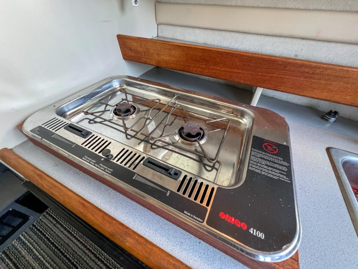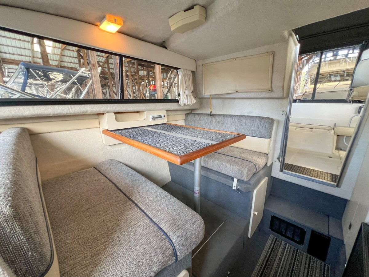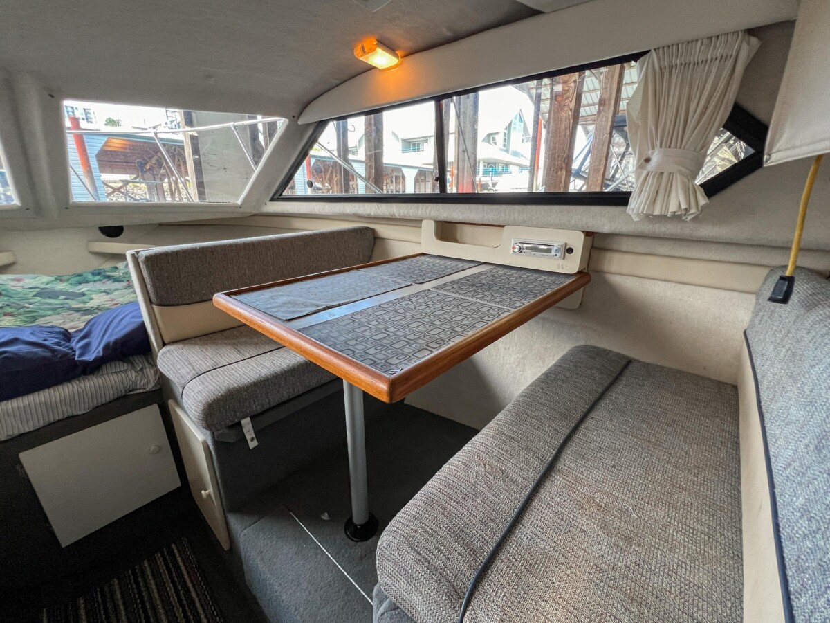 Below deck, the 2452 boasts large windows for natural light and ventilation. The comfortable V-berth forward sleeps two, while the dinette converts to sleep two more. The full galley includes a refrigerator and stove.