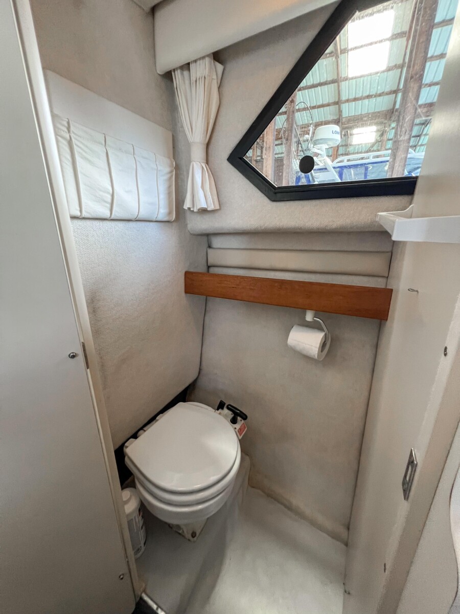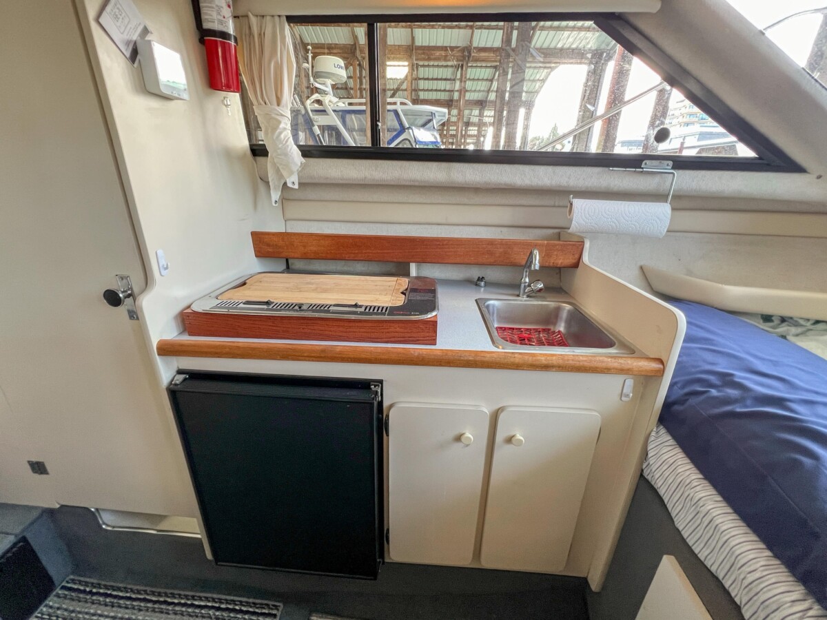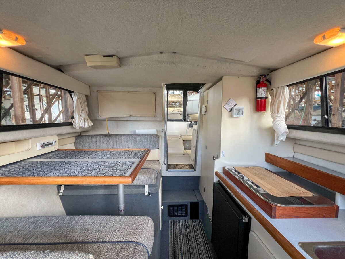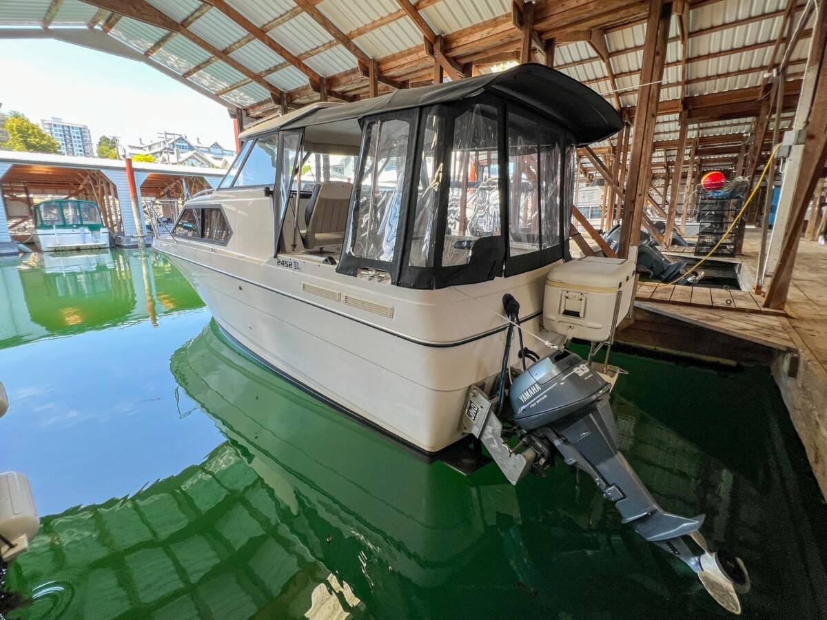 Below deck, the 2452 boasts large windows for natural light and ventilation. The comfortable V-berth forward sleeps two, while the dinette converts to sleep two more. The full galley includes a refrigerator and stove.