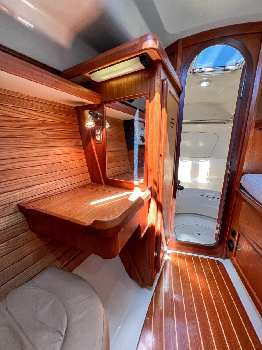 - Storage: Hanging lockers and drawer storage along port side, including vanity mirror and dressing table