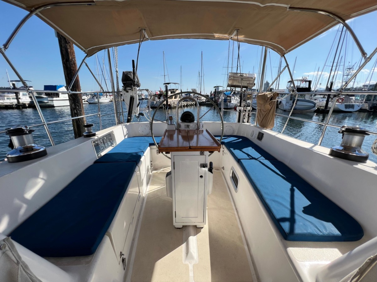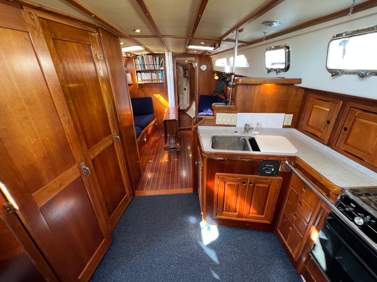 The expansive and open living quarters invite owners and guests aboard with 6’5″ headroom and hand crafted cherry-wood joinery. Upon entry, you’re met with a large and open galley to starboard featuring all the comforts of home. There is ample stowage throughout and stainless steel grab rails for added safety. Custom carpeting lines the sole (with teak and holly beneath) in the entry way up to the navigation station.