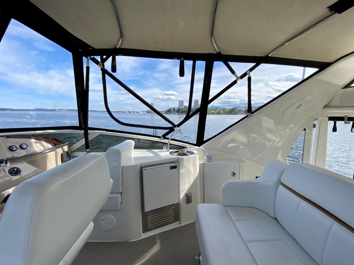 The bridge offers a relaxing environment, featuring a cozy L-shaped lounge that seats up to five people and a wet bar that provides convenient bottle storage. The elegant aft deck provides a hardtop that covers the entire deck, an electronics arch, and the convenience of an integral bridge stairway and wing doors. Moreover, the large cockpit offers ample space for fun and entertainment.