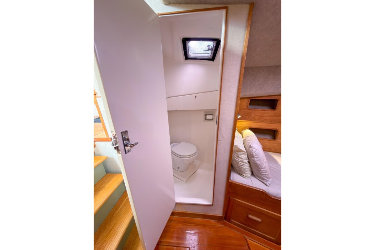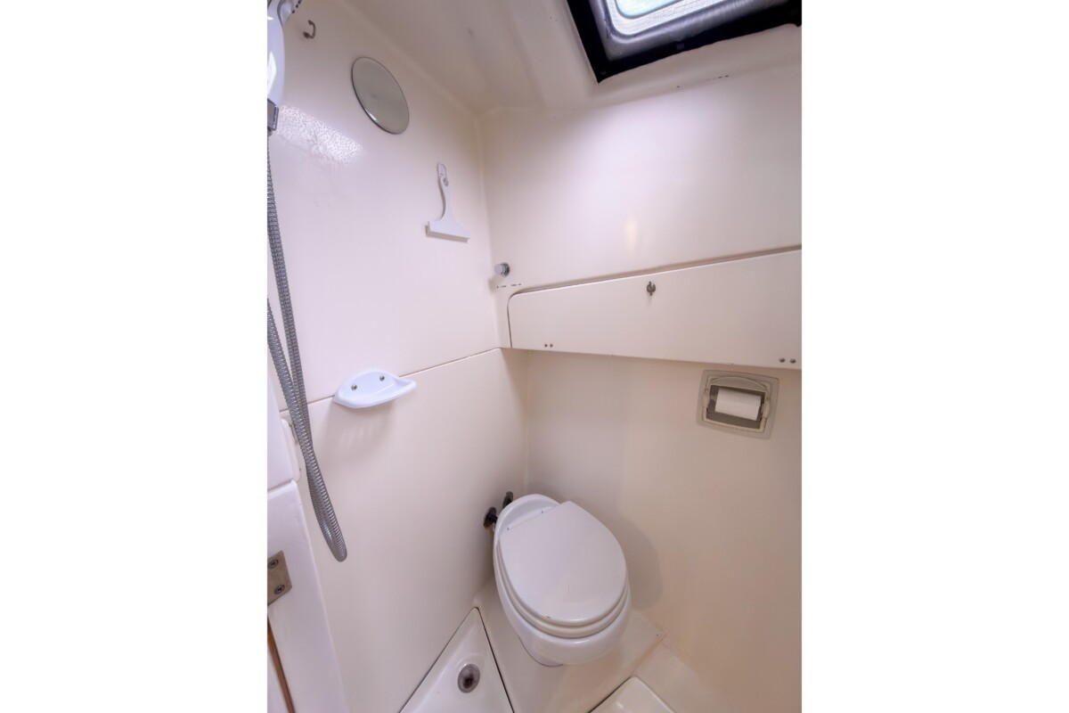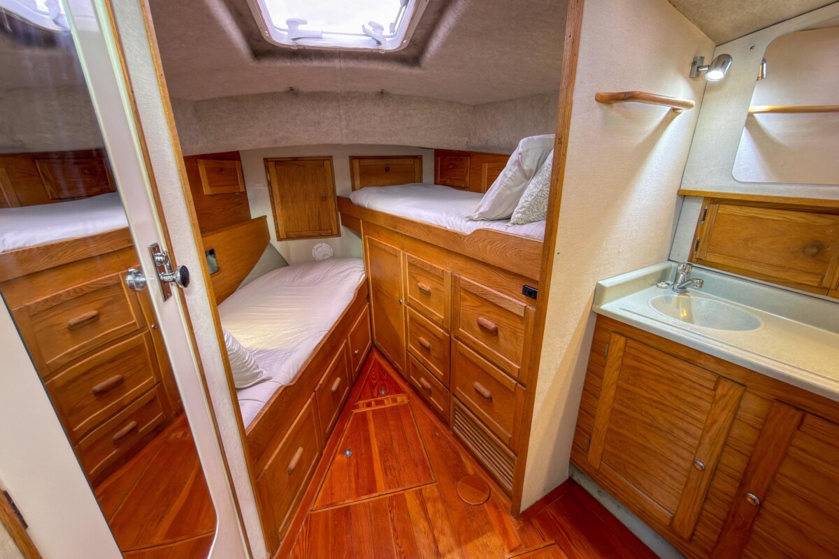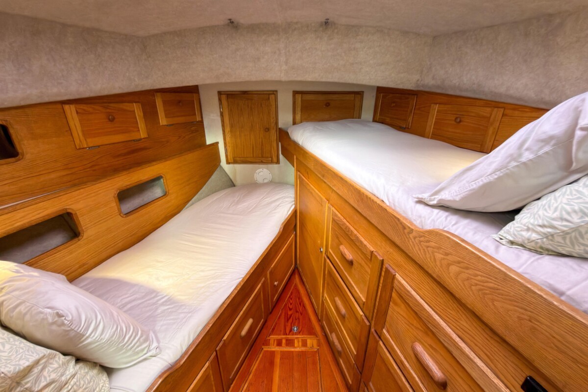 Forward cabin with two large single berths to port and starboard, each with ample storage below. Enclosed head with molded fiberglass shower and Tecma electric toilet.