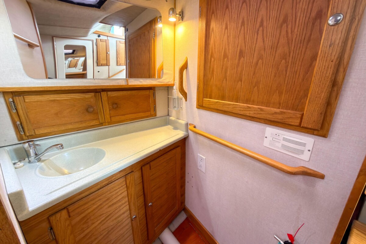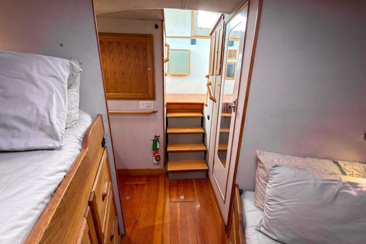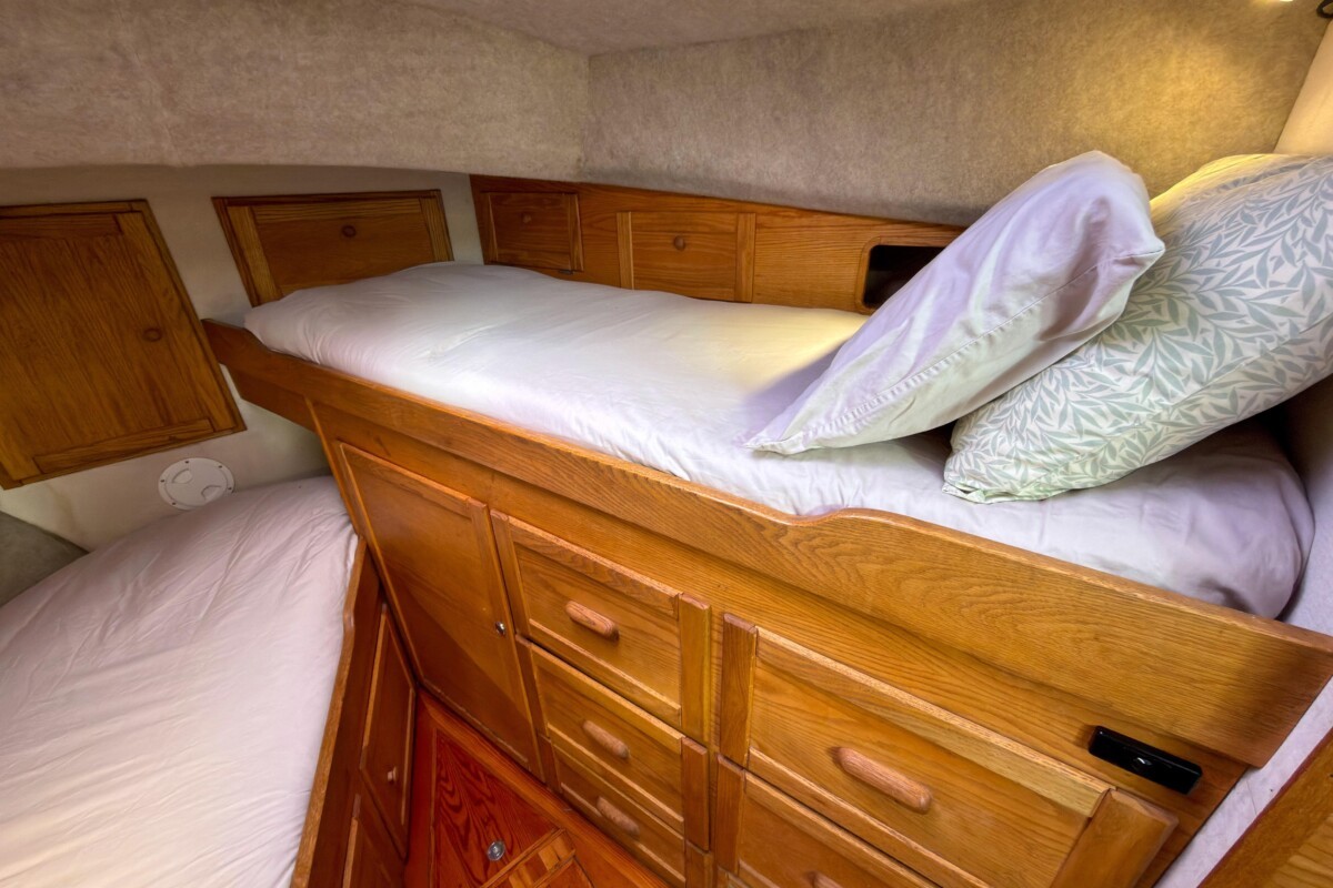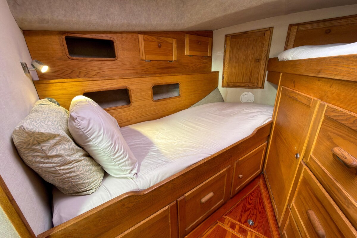 Forward cabin with two large single berths to port and starboard, each with ample storage below. Enclosed head with molded fiberglass shower and Tecma electric toilet.