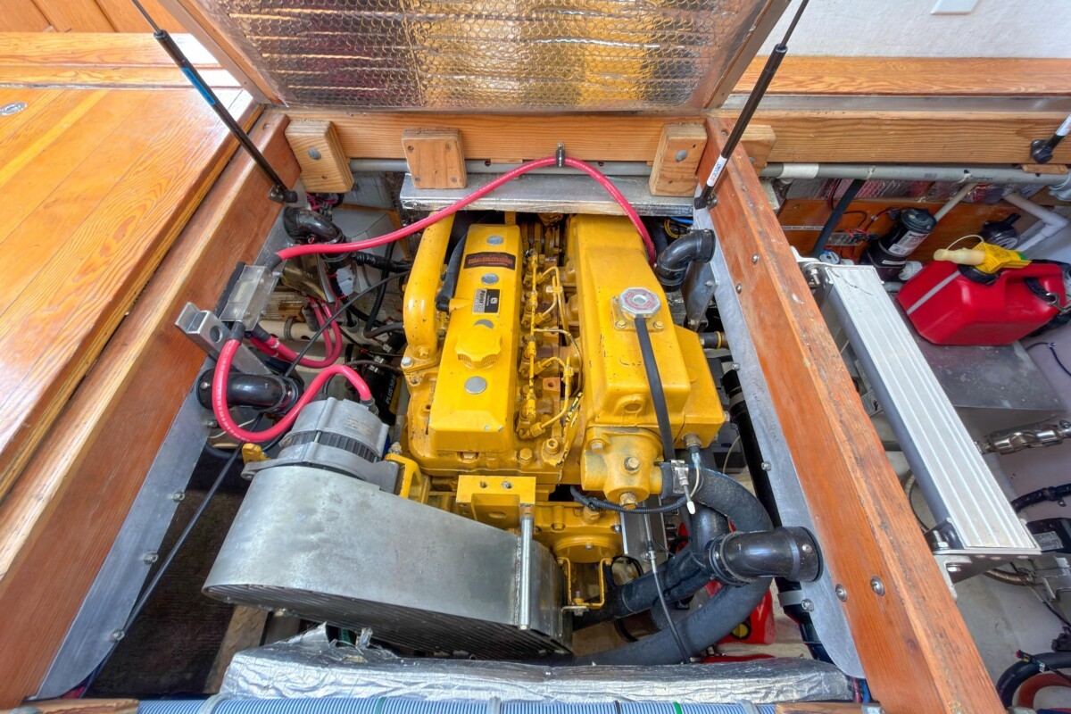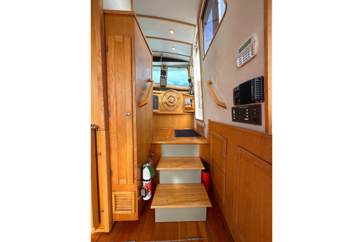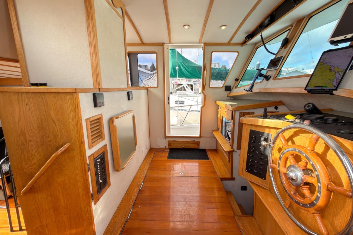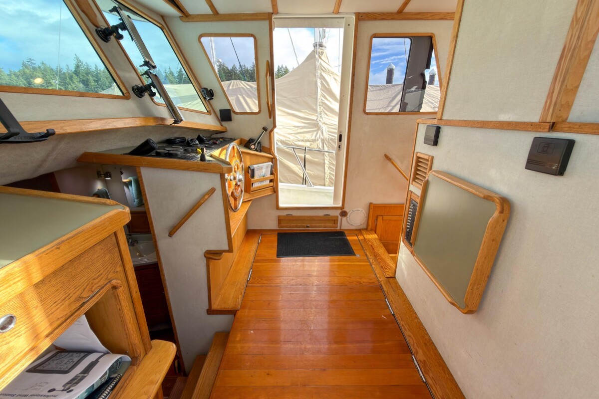 Custom finished interior with a practical, open layout. Tongue-and-groove fir set in epoxy, treated with S1, and finished with varnish. Venetian blinds with oak valances.