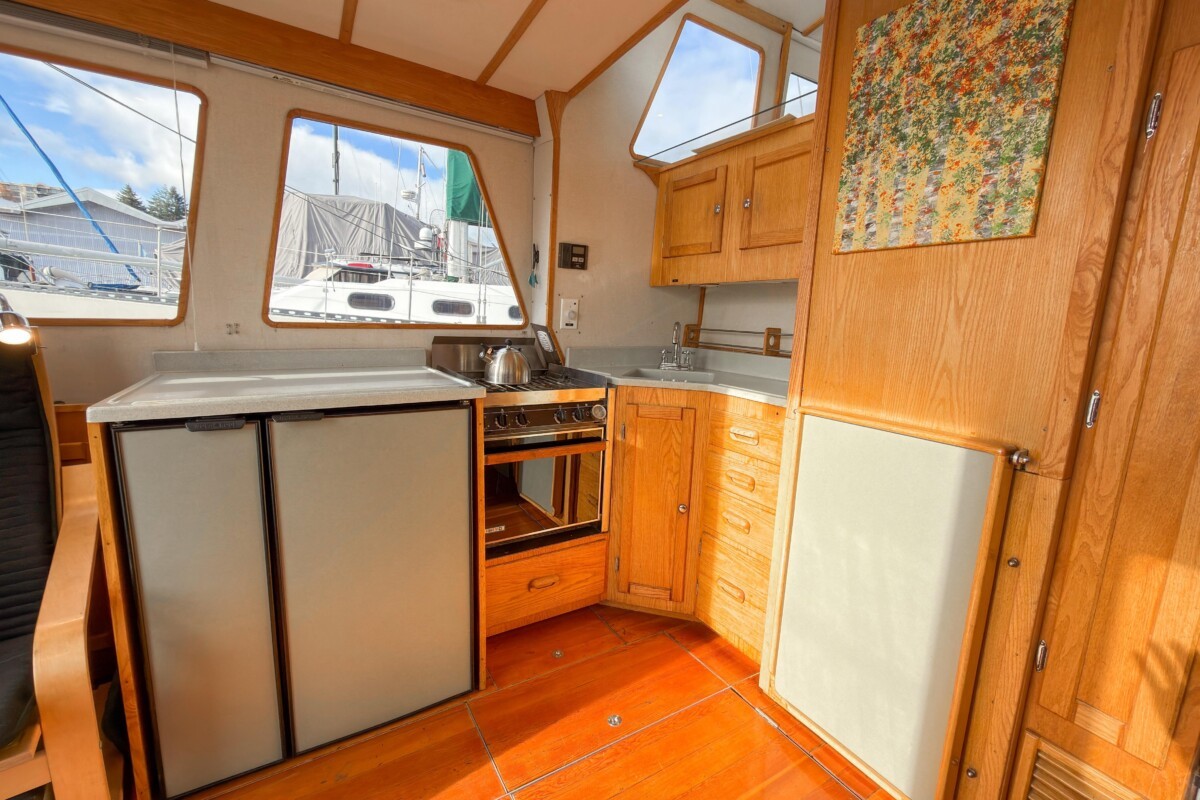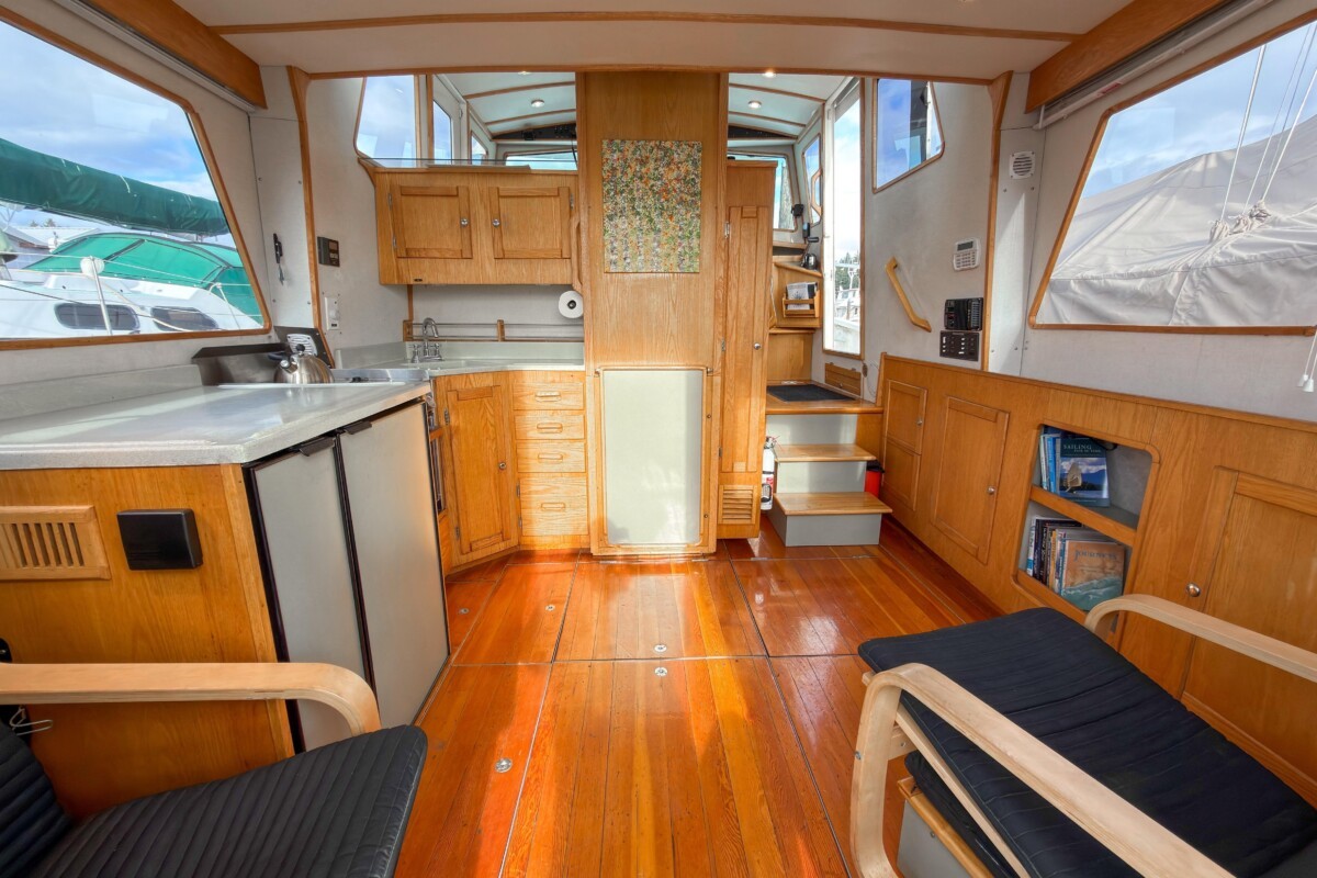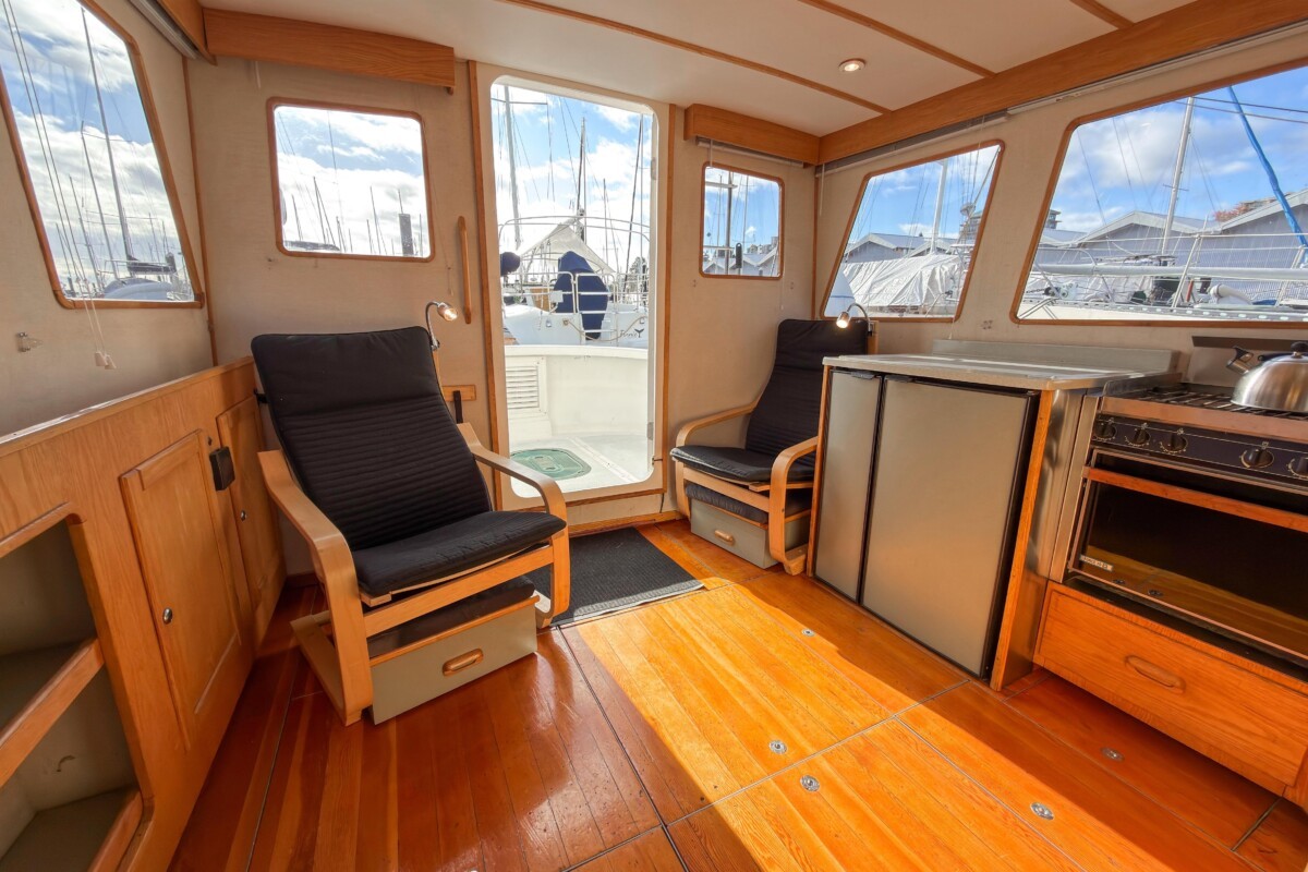 Large windows fill the salon with natural light. Two easy chairs provide a comfortable space to relax and enjoy the view. The L-shaped galley is efficiently arranged for meal preparation.
