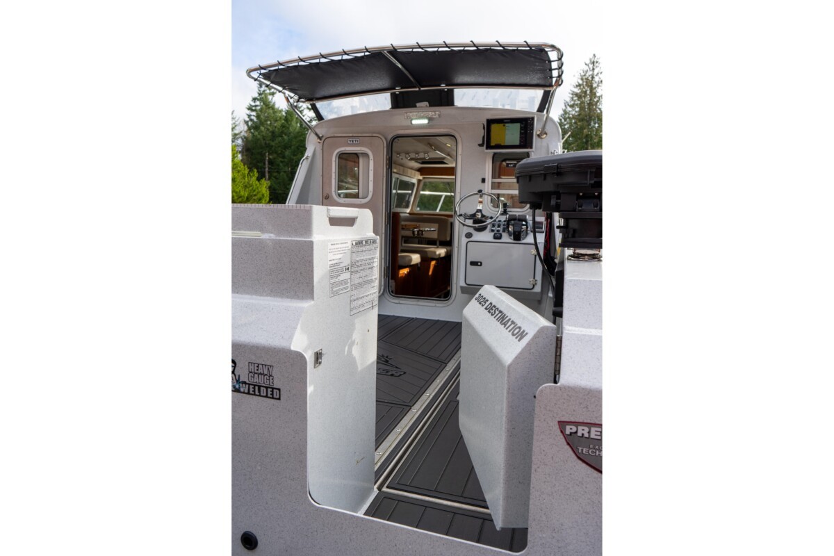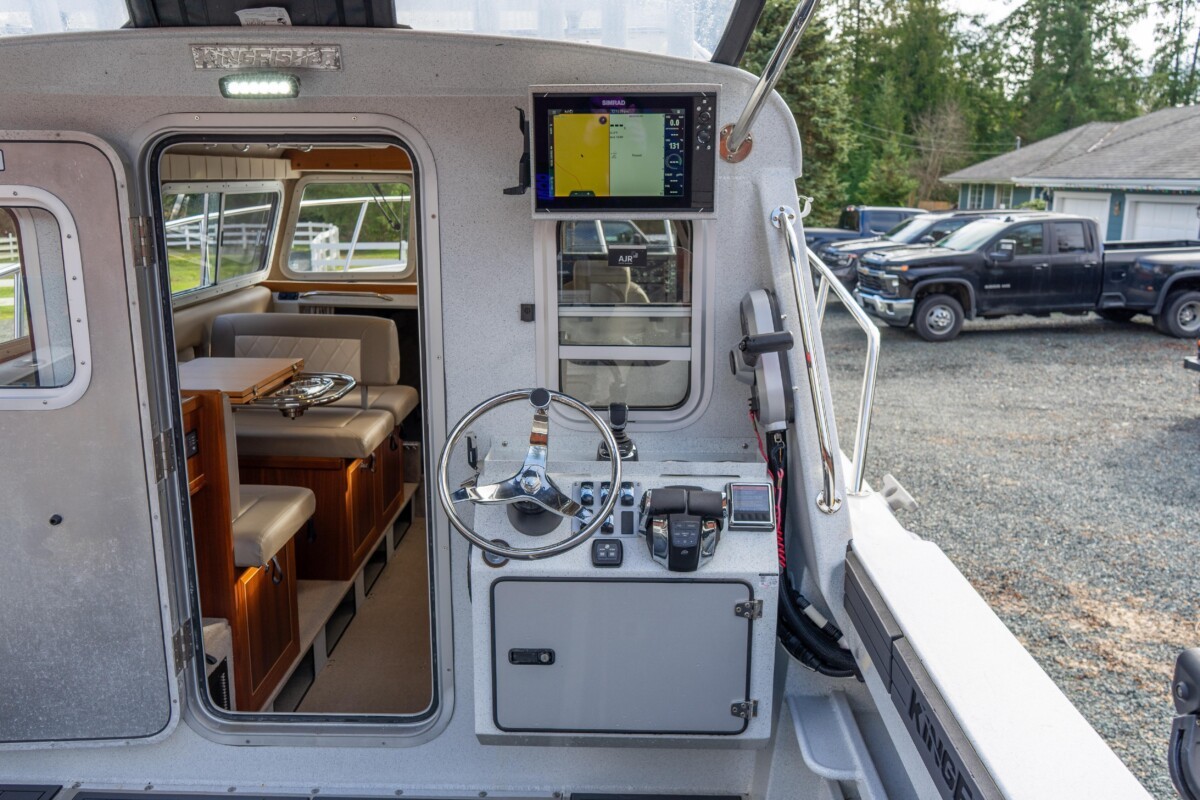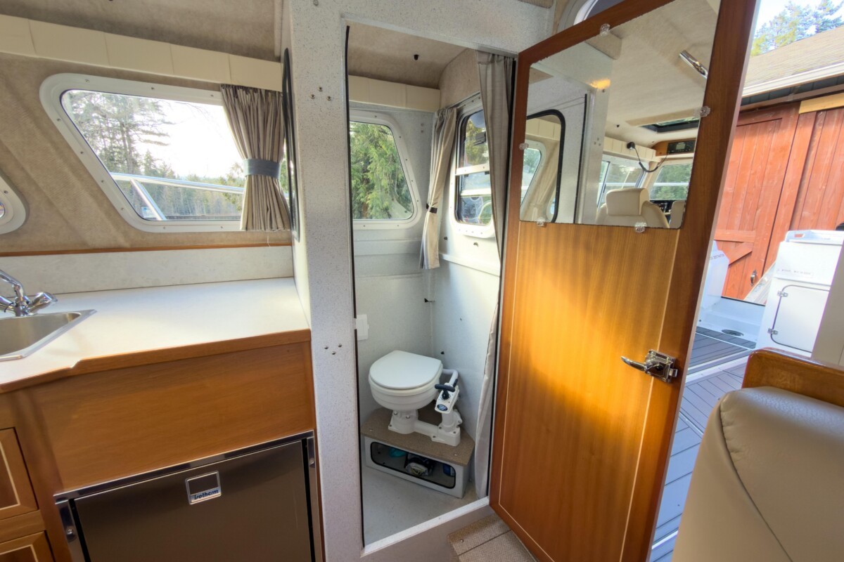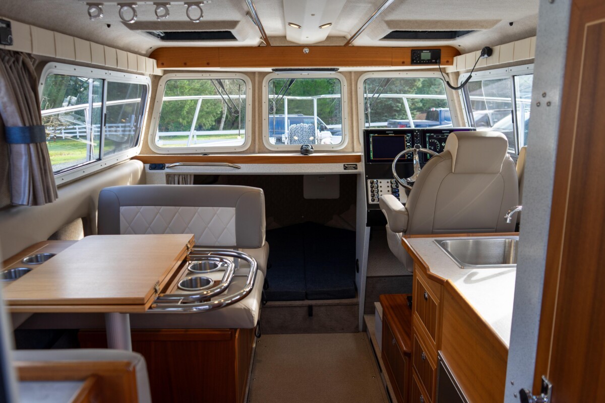 Inside, the Destination package offers a wonderful mix of warm wood tones, tasteful upholstery, and ample surfaces for meal or fish prep! Her diesel heating, stand-up enclosed head, inverter, convertible dinette, V-berth, fresh water system, and Isotherm fridge complete this Pacific Northwest fishing machine!